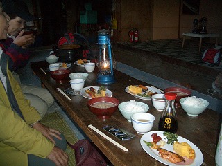 | キレット小屋朝食 使い水はテント場まで汲みに | 縦走してきた赤岳を背に朝日を浴びて | |