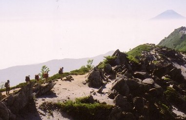 | 観音岳から北岳は指呼の内 今年は雪渓が残っていた | 観音岳を後にする 富士山を見ながら薬師へと | |