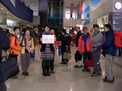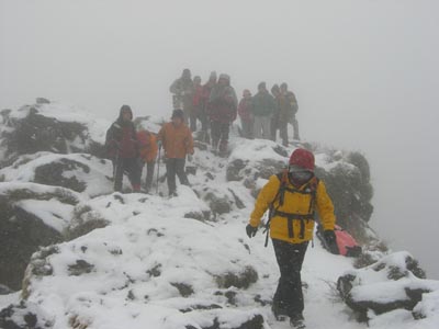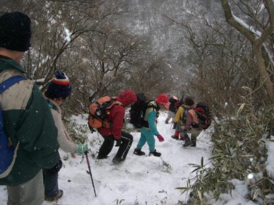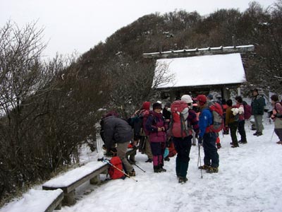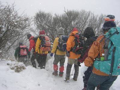| 今年は車は仁田峠まで行くことになりました リハビリ組はロープウエイを使い、他は妙見〜国見岳・普賢岳へと 霧氷はついておらず残念でしたが雪が出迎えてくれました。妙見岳から雪がちらつき、 普賢岳山頂では見る間に積もっていきます。風も強くお昼は肩の辺で昼食 帰りは青雲荘の温泉に入り、冷えたからだはポカポカに。 |