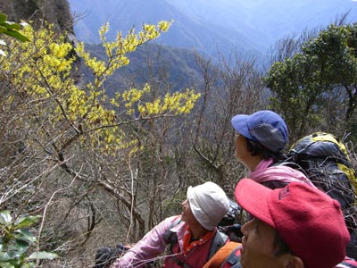 | 長崎発(8:00)ー平谷登山口へ車をデボー黒木登山口発(9:25)ー舞岳ー南壁ー昼食ー経ケ岳ー平谷越ー 平谷登山口(15:30) 春まず咲くというマンサク、舞岳に登り上がると遠くに黄色いマンサクの花が見える。 経ケ岳の南壁を巻いたところに何本もの木がある。南壁を巻くコースはザレ場で足元が不安定、 でもこのマンサクを見ようと他の会の人達も同じコースをたどっていた。 Lはトップを引くSLに「マンサクの下で昼食、どこかいいとこ探してよ」と指示 SLが座れるとこ探して昼食となりました 稜線のマンサクはこれからが見ごろでしょう、まだまだ楽しめます |