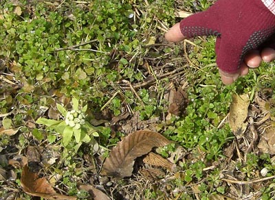 | 椎葉谷からこの分岐まで30分 | フクジュソウの群生地 ここも雪が残っています |