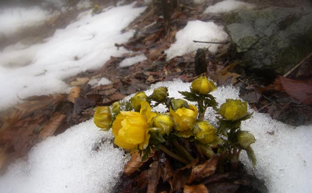 | 雪と雨の中のフクジュソウ | |