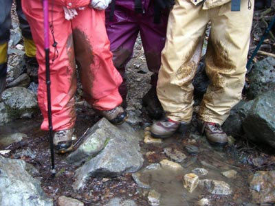 | 山頂は踏まずに仏石から下山 | 雨具はドロンコ |
