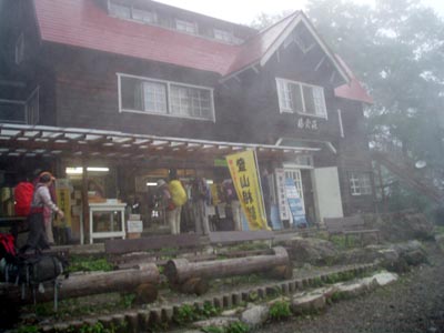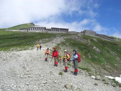 | 白馬大雪渓、落石に気をつけながら | 白馬大雪渓を登りあげると白馬山荘が |