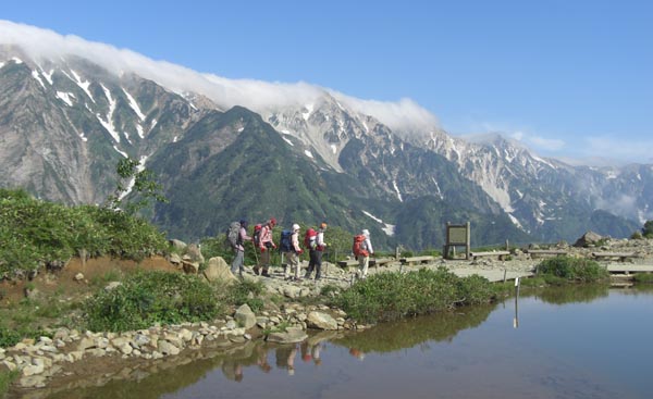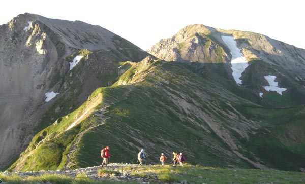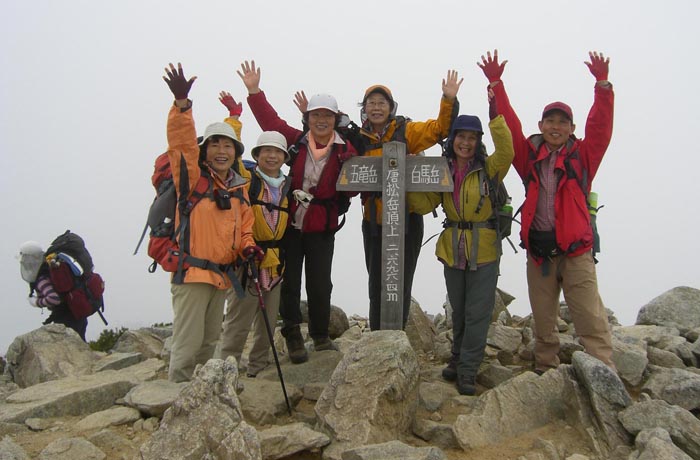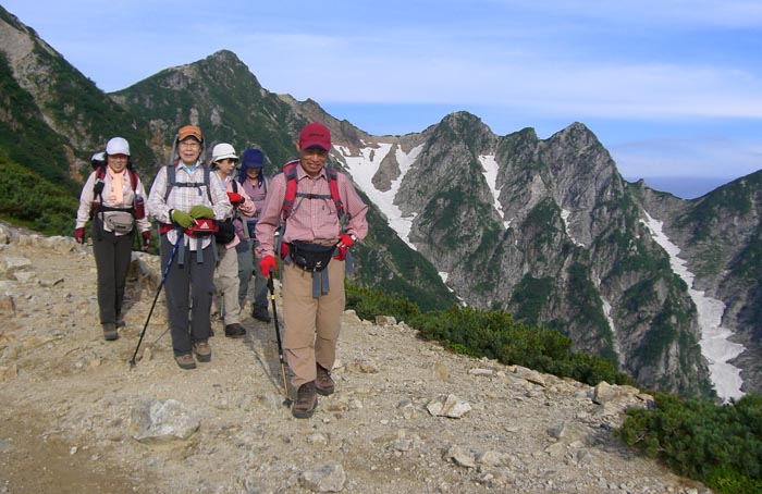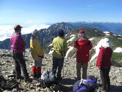 2日目 雷・大雨のため停滞 レンタカーで長野 善光寺・戸隠高原へ 3日目 民宿の方に送ってもらうー猿倉(6:15)ー白馬尻(7:30)ー葱平(9:45)ー村営小屋(12:40)ー白馬山荘(13:15)宿泊受付済ましー白馬岳(14:05) 4日目 白馬山荘(4:40)ー杓子岳山頂(6:40)ー白馬鑓が岳山頂(8:00)ー天狗山荘(9:10)ー天狗の頭(10:10)ー天狗の大下り(9:45)ー 不帰キレット (12:35)ー唐松岳頂上(15:30)ー唐松岳頂上山荘(15:55) 5日目 唐松岳頂上山荘発(6:00)ー丸山ケルン(6:40)ー八方池(8:05)ー八方ケルン(8:25)ーリフト(9:25)ー八方駅(9:55)ー民宿ラべニュー栄で温泉入浴 白馬駅(12:25)ー松本ー名古屋ー新幹線ー博多ー長崎着(23:10) 大糸腺から白馬駅までの車中雷と大雨 駅に降りる頃は雨が止み白馬三山がくっきりと見えた。民宿の方が迎えに来てくださる 2日目の朝も雷がひどく、テレビの天気予報をずっと見ながら1日停滞(結果的には白馬の雪渓は10時までクローズアウト)。宿のご主人の世話でレンタカーを借り(5000円)長野の善光寺へ観光 そこから戸隠高原へ走り 戸隠連山を見ながら、忍者からくり屋敷等を体験する 一日停滞が功を奏し翌日からピンカーンの上天気 白馬岳山荘到着の頃はガスッていたが夕刻は剣岳が少し頭を出す 白馬から杓子・白馬鑓・と通過し天狗山荘でうどんを食べる。天狗の大下りを慎重に下る。づっと剣が右手に見え、立山三山・ケ岳・槍と 不帰キレット1峰の鞍部からU峰の岩壁にへばりついている登山者を見る 11時間かけて唐松頂上 みんなでばんざーい!! 最終日は五竜岳・鹿島槍ケ岳を見ながら八方尾根を下る。リフト・ゴンドラを乗り継ぎ八方駅へ。最初に泊まった民宿でもう一度温泉入浴 その日のうちに長崎へ 画像はAkemi・Kikumiさんから |