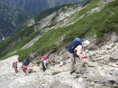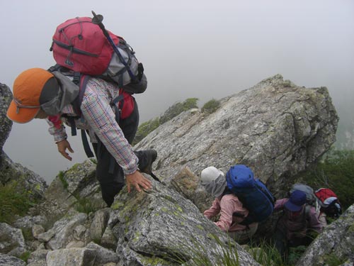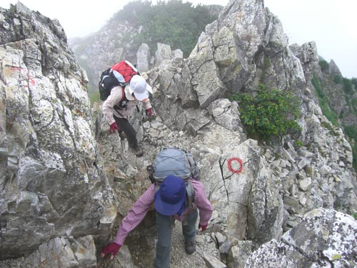 | 天狗の大下りから今日の核心部 《帰らずのキレット》 を行く きついところでした | |