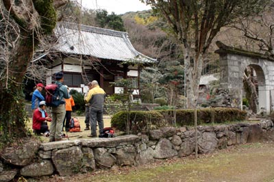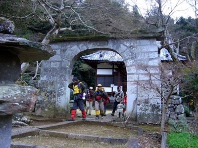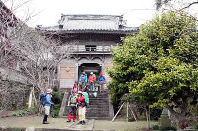 | ★参加者 L田中オ 泉・田中チ・村井・久保ヒ・酒井マ・酒井ミ・俣野・中村・松本 会員 10 名 ★コースタイム 高浜海水浴場発(10:00)ー殿隠山(10:55)ー遠見山(11:30)ー観音寺(12:10〜13:00)ー水仙の里 薄墨色の空を眺めながら午前中はなんとか持ちますようにと願う。 尾根は北風が強く吹きつけ冷たい、殿隠山を過ぎたところで展望が開けるがこの空模様では遠望は望めませんでした 遠見山での昼食予定が観音寺でということになる。 1月18日は初観音で御堂には各地からお参りの方々が座っておられます。4年前、皆でご詠歌・お経・説教を1時間ばかりいただいた観音寺、皆さんそれぞれの思いでお参りを。 水仙の里までは歩道を歩く。小雨の中を展望所往復 甘い香りが漂う水仙の群生、いっぱいいっぱい花を愛でました |