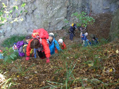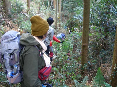 | 竹林を過ぎて不安定な足場にバリバリッ KさんMさんが降りて誘導 遠巻きする 烽火山への雪道 | |