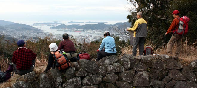 | 遠見山山頂で集合写真 | 遠見山から樺島を眼下に |
