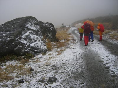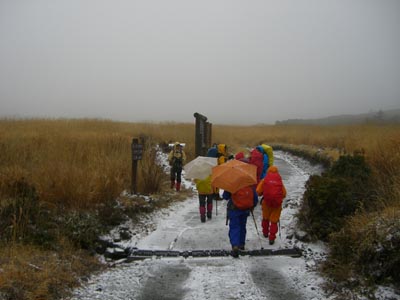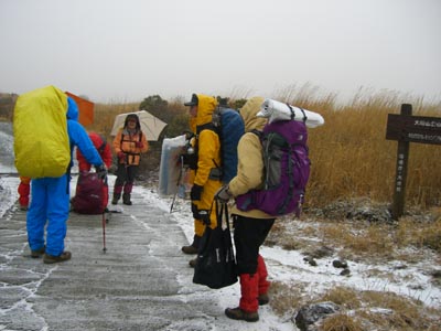 | ★コースタイム 1日目 長崎(9:00)ー九重ー吉部(12:05) 吉部登山口出発(12:40)ー法華院温泉山荘着(15:00) 九重インターを降りると小雨、吉部駐車場でお昼ご飯を食べ、出発の準備 出発する頃には雨が雪に変わり、みるみるうちに雪が積もっていく。 男性3人はテント泊まりで大きなザック、女性5人男性1人は法華院温泉山荘泊まり。 注意報通り強風が吹き荒れ、法華院温泉付近は地吹雪ツアー並、周りの景色も何も見えない |