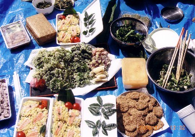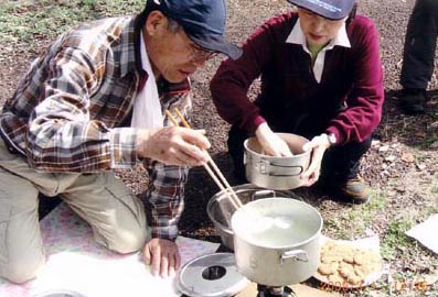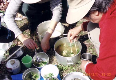 | 山菜と卵のお吸い物 | 本日のご馳走 山菜のてんぷら・よもぎの団子・ノビルの酢味噌和え |