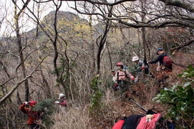 | ★コースタイム 中山キャンプ場(9:10)〜笹岳(10:30)〜中山越(11:27)〜経ケ岳(11:20)〜尾根で昼食(13:05)〜中山キャンプ場着(14:40) のんのこ姉さん「今日は薮をこぎながら笹岳へ直登します そして経ケ岳へ トップ誰がしますか? 」 「・・・ではTさんですね よろしく」 尾根はふみ跡があるかないかの薮 のんのこ姉さん以外は皆始めてのコース 「はねるよー気をつけてー」 バシバシ枝が当たります こんな調子で笹岳へ。 尾根筋はシャクナゲが多くその時期は楽しめそうです 笹岳からの下りは急下降 笹岳の鞍部を黄色に彩るマンサクを堪能 経ケ岳は人・人・人 で昼食はこれまたどこやらの薮をこぎ・・・ 狭いスペースですが抜群の展望 ソーメンの滝まで下ると 「ここら辺から適当に薮をこぎ下ってね」 「・・・」 無事中山キャンプ場に下りてきました |