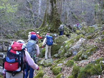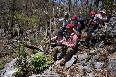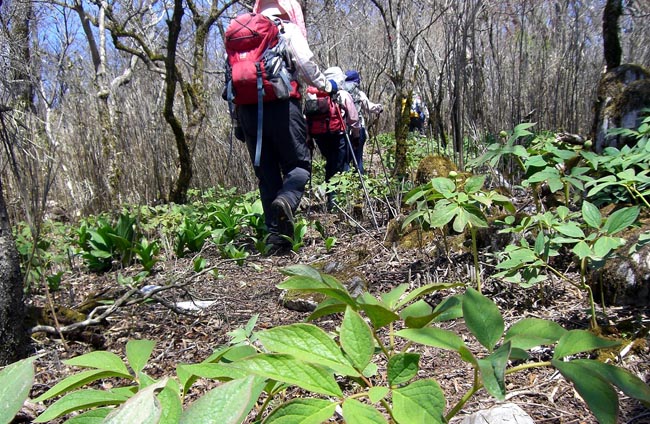 参加者 L酒井ミ SL田中オ 平野・松尾ア・前田・酒井マ・井川キ・久保ヒ・久保ク・中ノ瀬 会員 10 名 コース 長崎を8時出発 1日目高速松橋⇒霊台橋公園で昼食⇒五ヶ瀬⇒椎葉⇒峰越峠着(15時30) 2日目テント場発(6:30)⇒御池登山口(7:30)⇒御池・ドリーネ(9:30)⇒白鳥山(10:10)⇒時雨岳 (12:00)昼食・下山開始(12:35)⇒林道着(14:00)⇒椎葉ダム(15:00)⇒人吉(17:00)⇒ 長崎(20:30) 久しぶりのテント泊、先週のテント・ターフ張りの学習が功を奏し素早く張ることができました。テント場は水がないところ、Tさんが用意していた炭焼セット・大量の水で不自由なく仕度ができた。 五家荘側は通行止めでしたが念のため御池登山口まで下見に、やはり車は通れそうにないということで登山口まで小1時間歩くことに 地図コンパスで現在地・方向を確認、トップをTさん、石灰岩の点在する沢をつめる、上を仰ぐと芽吹いたばかりの新緑が眩しい。どこら辺からヤマシャクヤクを目にすることが出来るか皆わくわく、御池・ドリーネの周辺で群生を発見、。 Kクさんが膝通でKヒさんと共に駐車場へ下山。白鳥山頂からトップをIキさん。後ろでHさんがサポート。 時雨岳までの縦走路はニリンソウ・ケマン・ホソバコバイモがこっちにも目を向けてよと言わんばかりに。南斜面に三分咲きの花を見つけデジカメで激写。時雨岳から沢を直下降、Hさんが足がつり(今までにない激痛のよう)、Nさん・Mさん・Iさんが林道歩きで連絡に、携帯が通じず駐車場まで大変でした。帰りは椎葉ダムから人吉インターに。テント泊まりで炭火を囲みながら山談義、会員の親睦がはかられ、二日間とも好天気であったことでよしとしましょう。 |