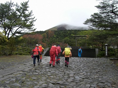 | 高千穂河原 神社へ安全祈願のお参りを | 霧雨は止み雨具は脱いで 午前中の雨が土埃を沈めてくれて | |