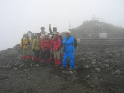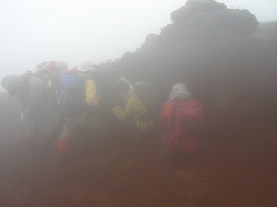 | 山頂はすぐにガスッてしまいました | 頭が痛くなるほどの強風です 岩陰に身を隠す | |