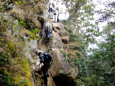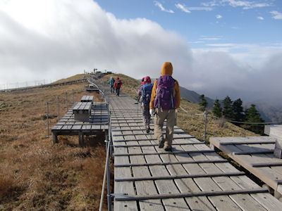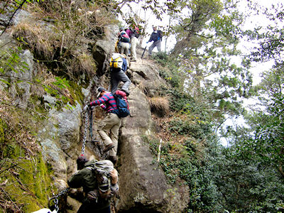 ★参加者 L田中オ SL久保ヒ・久保ク・酒井マ・酒井ミ・中ノ瀬・吉田 会員 7 名 長崎 6:00発ー山陽自動車道ー瀬戸中央自動車道ー徳島自動車道ー美馬ー国道438を南下ー16:15民宿剣神社泊 登山口発6:00-一の森8:20-剣山頂8:15-次郎岌ートラバースー登山口着11:45ー徳島自動車道ー松山自動車道ーイシズチスカイラインー 17:30国民宿舎石鎚泊 登山口発8:35− 二ノ鎖10:30− 三ノ鎖ー 石鎚山頂 −天狗へートラバースルート −二ノ鎖場ー登山口着15:30 国民宿舎面河着16:30 面河渓散策 10時に面河発ー松山自動車道ー西瀬戸自動車道・しまなみ海道ー山陽自動車道ー長崎着20:00 石鎚山と同じく四国を代表する名峰剣岳(1955m)、 剣という名がつく山は、たいてい岩が剣のように鋭くとがっているが、四国のそれは違った。 山頂はなだらかな草地でした。伝えによれば、安徳天皇の御剣を山頂に埋め、これを御神体としたから、剣山と呼ばれるようになったという。 石鎚山(1982m)は西日本最高の山、石鎚神のいます山としてあがめられ、昔からどれほど多くの人たちが登ったことでしょう 私たちはこの名峰を「きつかねー」「綺麗ねー」「すごいねー」「あそこ見てよ」「何とかしてー」などなど、数え切れないほどの雄叫びをあげながら歩きました。 石鎚山の鎖場では三点支持を念頭におきつつ、男性陣のフォローを受けながらなんとか登りきることができました。 石鎚スカイライン・面河渓は紅葉の真っただ中、その中に身をおく至福のひとときをみんなで味わいました。 |