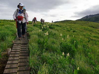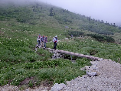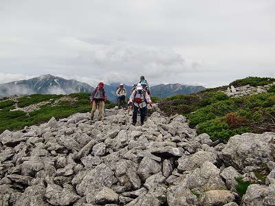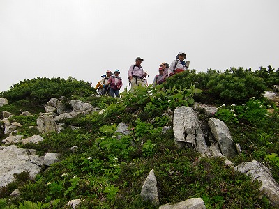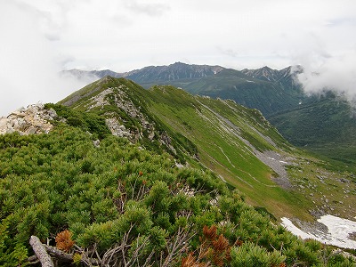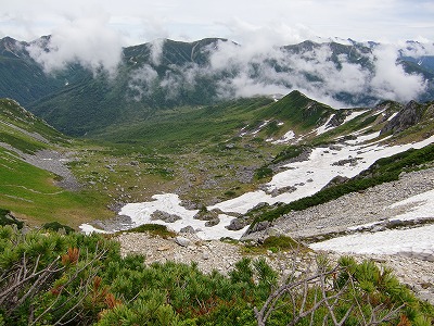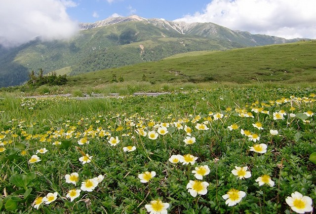 | 5時間くらい登り上げると開けました チングルマの群生と薬師岳がどーんと見えます | |