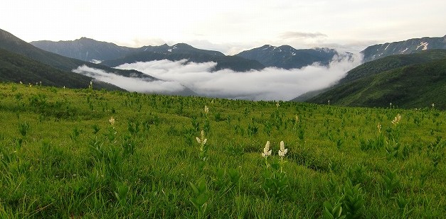 | 山小屋近くから見えるコバイケイソウ 雲海の奥に左から水晶岳・鷲羽岳 | |
