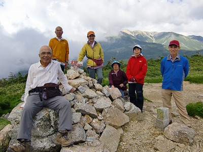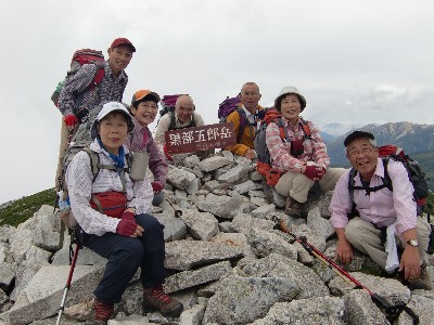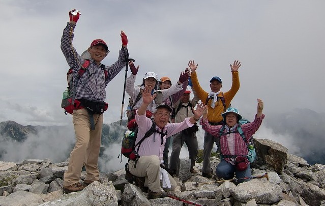 | 黒部五郎岳山頂 三角点でバンザーイ 喜びを分かち合う | |