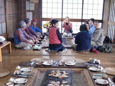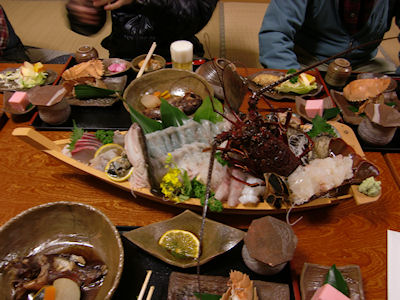 | 民宿での夕食 Kikumiさんのお母さん手作りの甘酒をいただく | すごい料理 伊勢エビが活きている いか・さざえ・あわびも | |