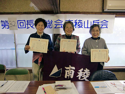 | ★2010年 3月27(土) | 日本勤労者山岳連盟より永年功労章が吉田さん・田中さん・村井さんの3名の方に、 会長より代読・表彰がありました。(県連全体では5名) 3名の方は30年近く山岳連盟に加入しておられます |