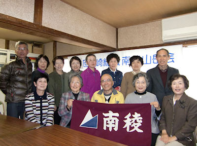| 事務所で 後ろの幕は先日の五島山行時のです 会を飾ってくれました | 永年功労章の3名の方々 |