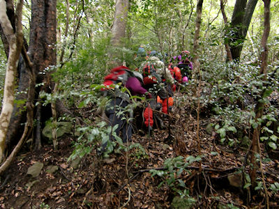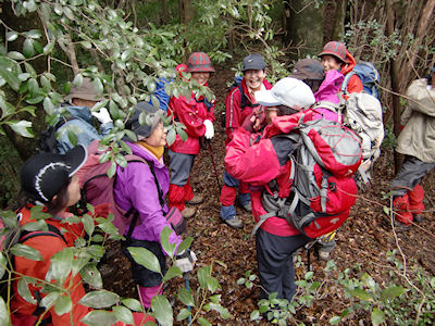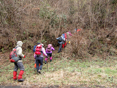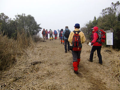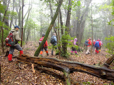 | ★参加者 L村井 SL松尾ア・吉田・中村・酒井マ・酒井ミ・久保ヒ・久保ク・井川キ・森 会員 10 名 *コース 北川内(9:40)〜遠目山〜遠目越し〜郡岳〜南登山口(3:30) 昨日一晩中の雨で下山道が滑りやすいということでコースの変更をしますとリーダー 登りは予定通り尾根を直登、尾根筋から郡岳へ変更となる 車を南登山口にデボし、北川内から取りつく |