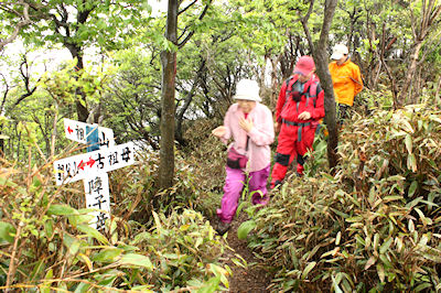 | 障子岳山頂 ガスッてなければ祖母・傾と見渡せたけど・・・ | 祖母・傾の縦走をした4人の方々はこの分岐は感慨深いものだったでしょう |