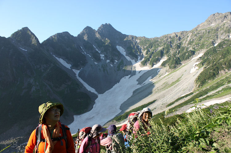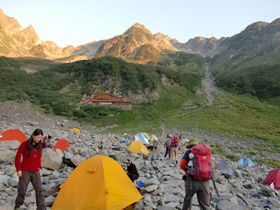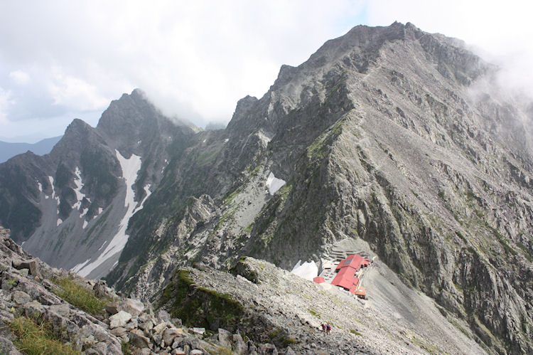 | 涸沢から穂高山荘 明日の奥穂高が聳え立って 先発隊の4人が先に下っています | |