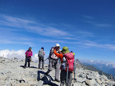| やっと南稜尾根を登りきって 前穂へのつり尾根尾根が見えます | 北穂に登りきって |