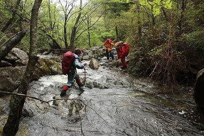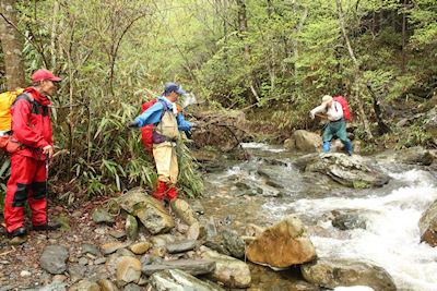 | 足場の悪い長い長い下り | 最後にTanakaさんが渡るときはザイルを撤収 オイオイ・・・ |