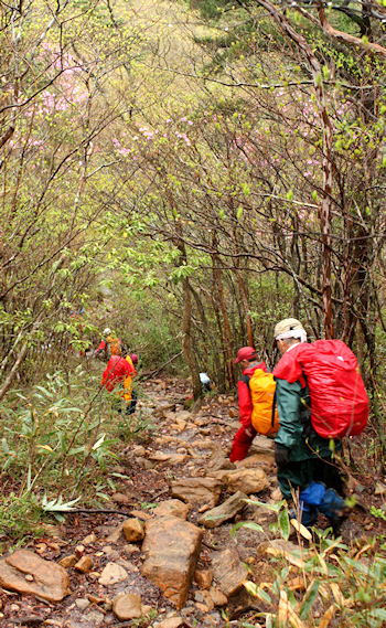 | 銅山峰ヒュッテ 朝の一服を御馳走になる | 斜面はまばゆいばかりのアケボノツツジ |