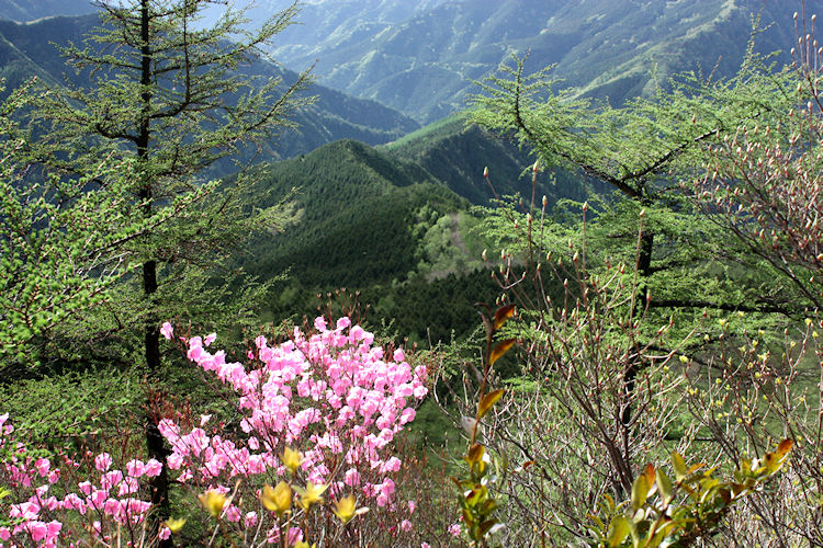 | ちょっと陽がさし、若草色の中にひときわ目立ったアケボノツツジ | |