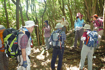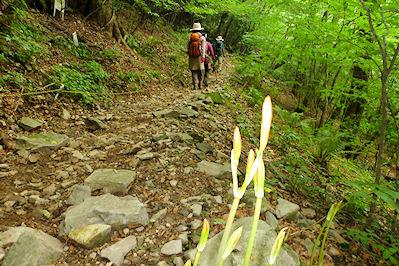 ★ コース・その他 黒木(8:15)〜舞岳〜経ケ岳〜平谷越〜中山越〜金泉寺〜黒木(15:50) 里は34度、うだるような暑さも稜線に上がると心地よい風が吹いていました。夏山訓練とあって皆さん元気に足を運んで、中山越からは黒木に下山コースと、金泉寺経由下山のコースに分かれてました。 |