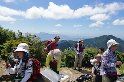 | 稜線にあがると心地よい風が | 経ケ岳山頂 遠くは雲仙山系 |