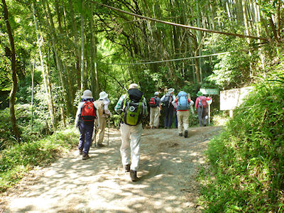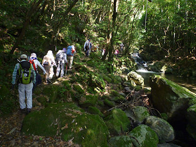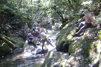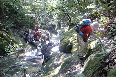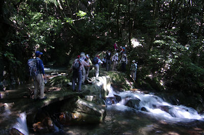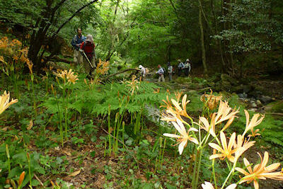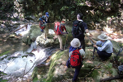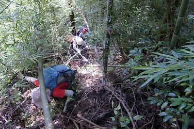 | 徒渉のあと竹藪こぎに苦戦する | キツネノカミソリの群生地を |