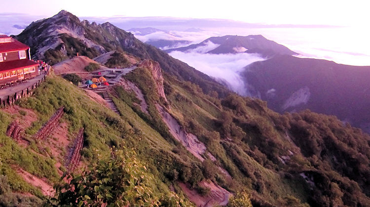 | 常念小屋前から日の出 | 常念小屋が真下に |