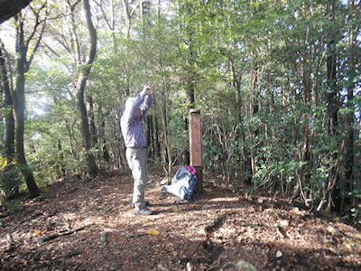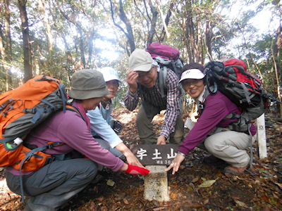 | 鳴鼓岳山頂で宇土山にコンパスを合わせる | 宇戸山の三角点にタッチ |