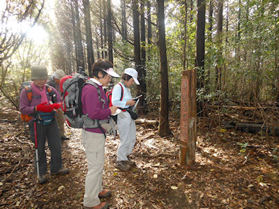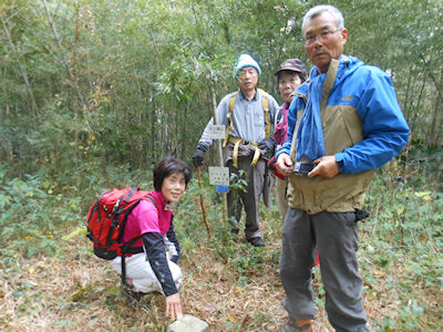 ・鍋冠山から一気に下り、車道を歩き、女神大橋の少し手前の 登山口から畑の中を通り、 竹林 (ここの竹は節の間隔が孟宗竹の半分以下だ!)の中を藪こぎ。 30分後大久保山頂着。 3等3角点(234m)にタッチしました。 ・小ヶ倉方面に下山途中に石標「八郎岳子午線標」を発見。 八郎岳山頂の天測点から真北4.4km地点との説明あり。 ・小ヶ倉の小高い畑の中で昼食。戸町で解散しました。 |