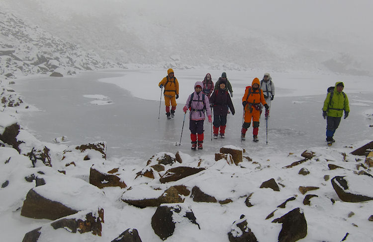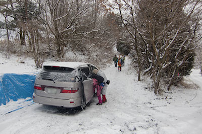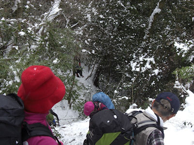 | 天狗ケ城から下る 《渡れる?》 | お池は凍結 みんなで渡れば怖くない | |