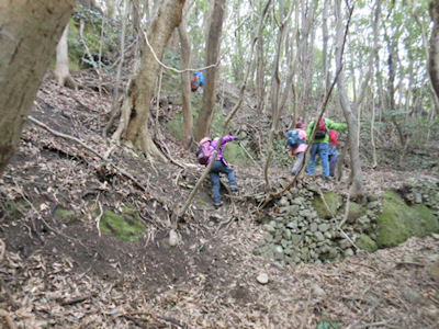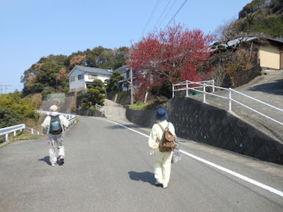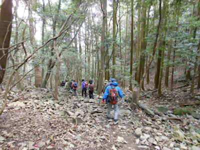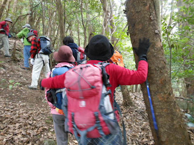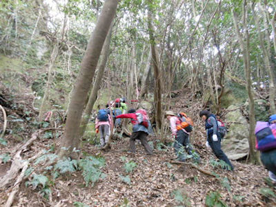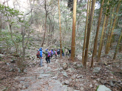 | ★ コース・その他 曇り時々晴れ 14.5℃ 松本さんから画像・コメントが送られてきました 上床発(9:35)--旧道入り口(9:40)--滑石トンネル上発(9:52)--休(11:13〜16)--休(12:17〜20) 岩屋山頂(475m)着(12:30)〜昼食〜発(13:40)--岩屋神社着(14:20)〜震災復興祈願〜 虹ヶ丘小前着(14:30)解散 ・アップダウンの多いコースはやせ尾根や岩場など変化に富んで、面白い。 ・歩行中は気温8℃前後で寒さを感じたが、山頂の広場は18℃もあり暖かかった。 ・帰りは急坂を40分ほどで一気に下り、アットゆう間に岩屋神社に着いてしまった。参道沿いの梅がちょうど見ごろであった |