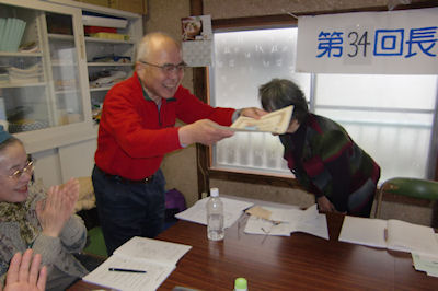 | 日本勤労者山岳連盟より永年功労章(20年)が松尾美保子さん 田中修さんへ贈られました、 田中信子さん代読・表彰 | |