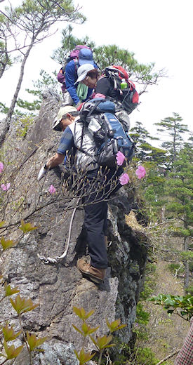 | Kuboさんがザイルを付けてくれました | 緊張の鹿の背 | 二連梯子を |