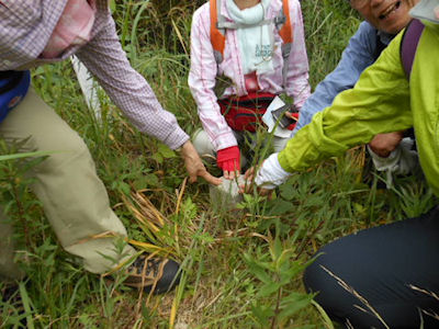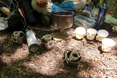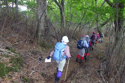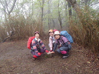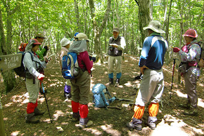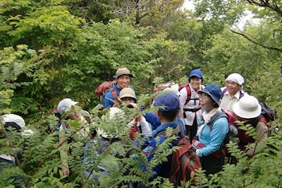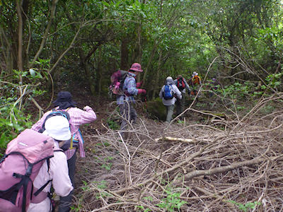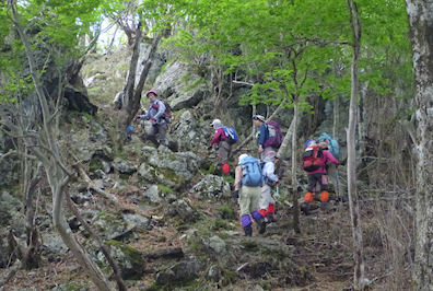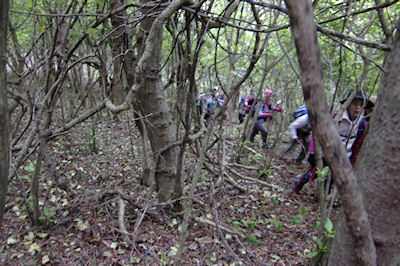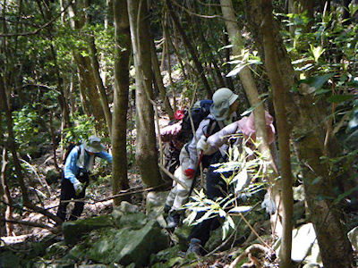 | 急斜面をルートを探しながら登ります | 最初の目的地《たぬきだまり》に12時到着 ここで昼食休憩 |