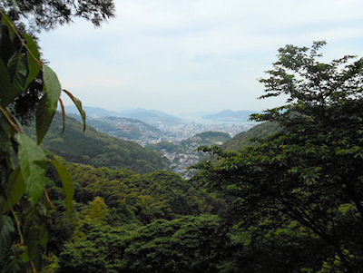| 隠れキリシタン跡の尾根から雲仙温泉市街が見渡せ 向こうに平成新山 | ||