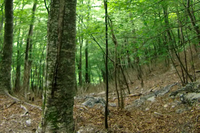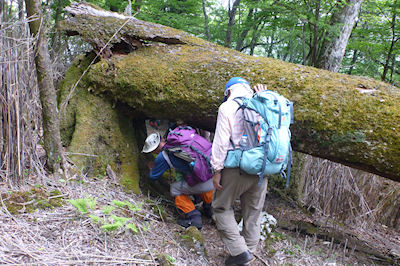 | ブナの倒木の下をくぐって | 扇山山小屋 |