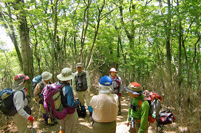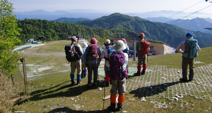 | スキー場から山々の説明を聞く 左に阿蘇根子岳が見えます | |