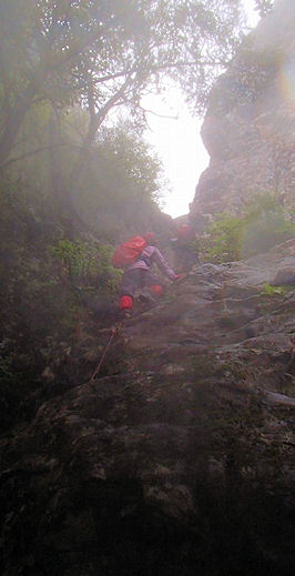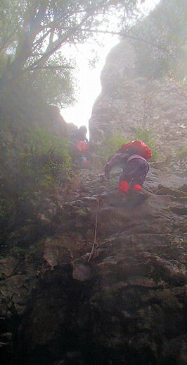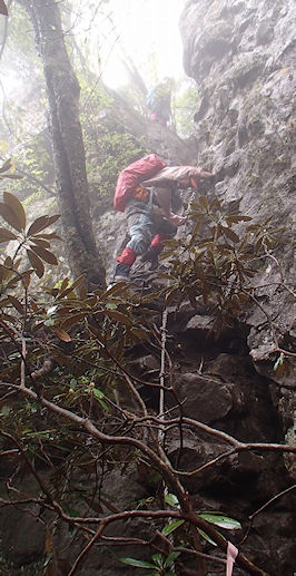 | ★ コース・その他 田中さんから画像・コメントが送られてきました その岳ごとの岩場のザイルを掴んでの降下。大鋸・小鋸と同じぐらい、それよりもきびしい岩尾根のアップダウンでした。 必死に下っている姿を撮りました。 |