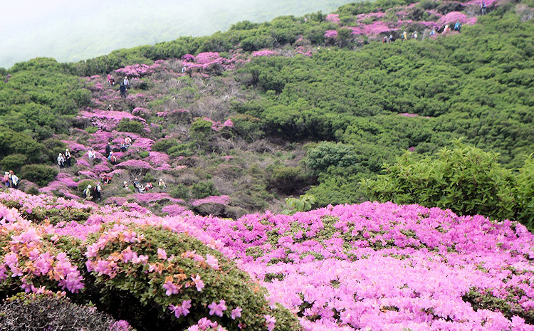 今日は天気も良くなりそう 駐車場にはもう車がいっぱい 駐車料金¥1000 火山土壌特有の黒土のぬかるんだ登山道を滑らないように必死に歩く。 時間が経つとともに人々で離合を繰り返すようになる 突然に広がる目の前の山頂 鮮やなピンクに染まった山容は 言葉では言い表せません 今回は吉部〜平治岳の往復です |
