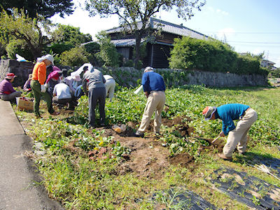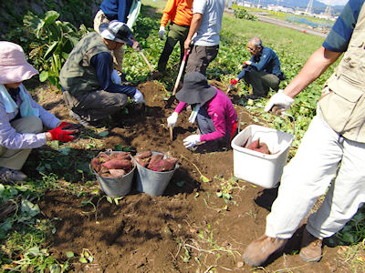 | 帰りは松本邸に寄り イモ掘り | 2種類の芋をどっさりいただいてきました |
